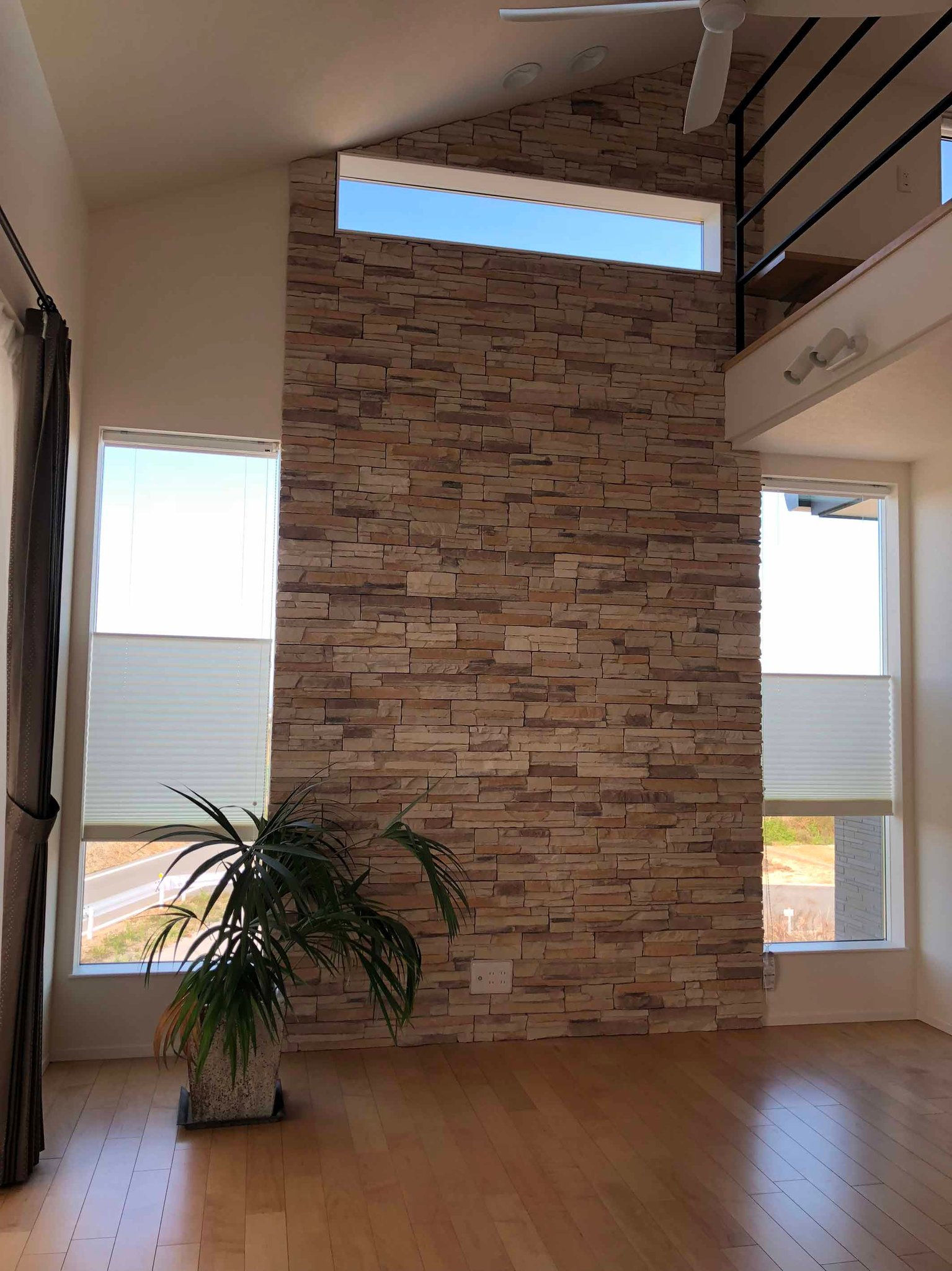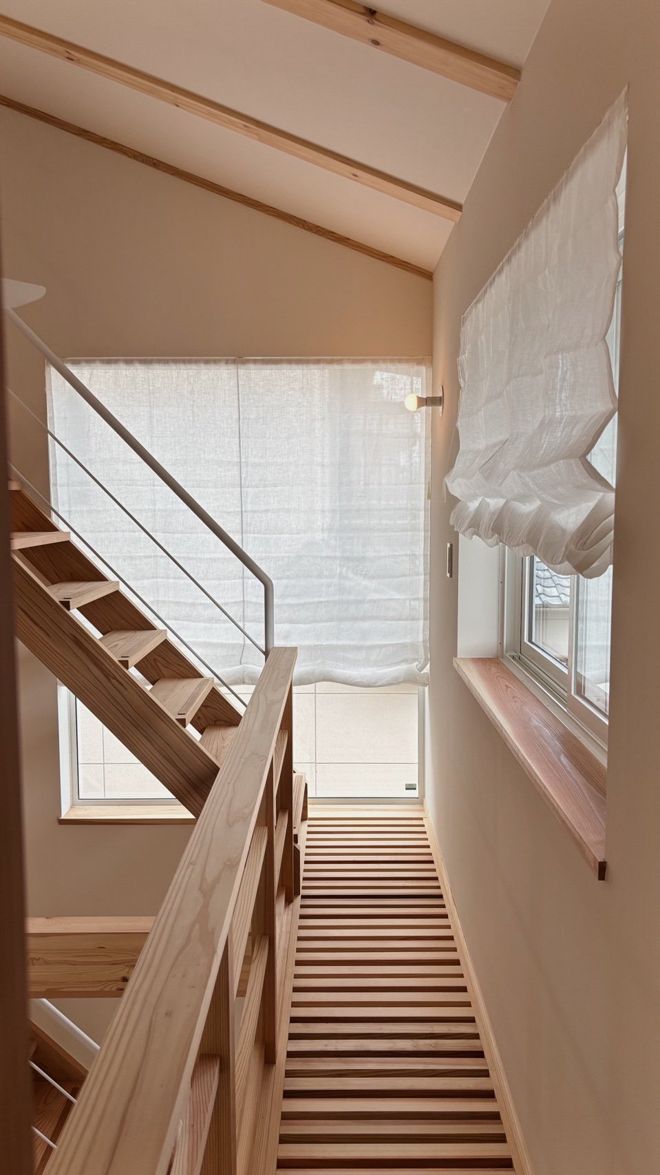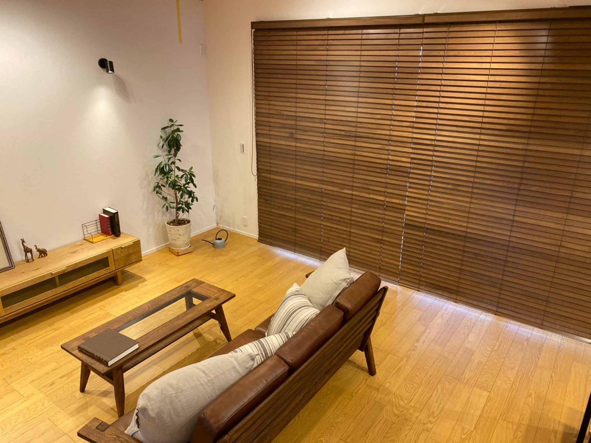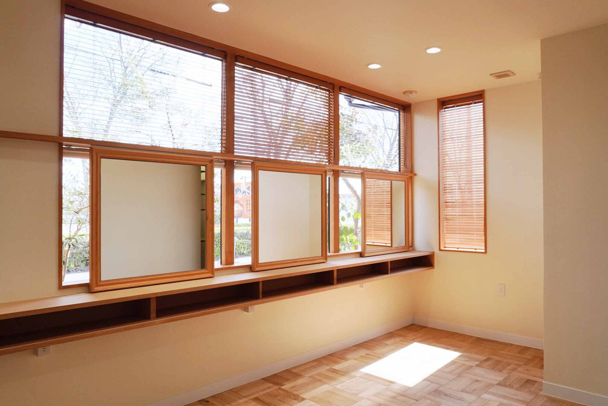 上下に開閉するプレーンシェード、木目が生きたウッドブラインド、