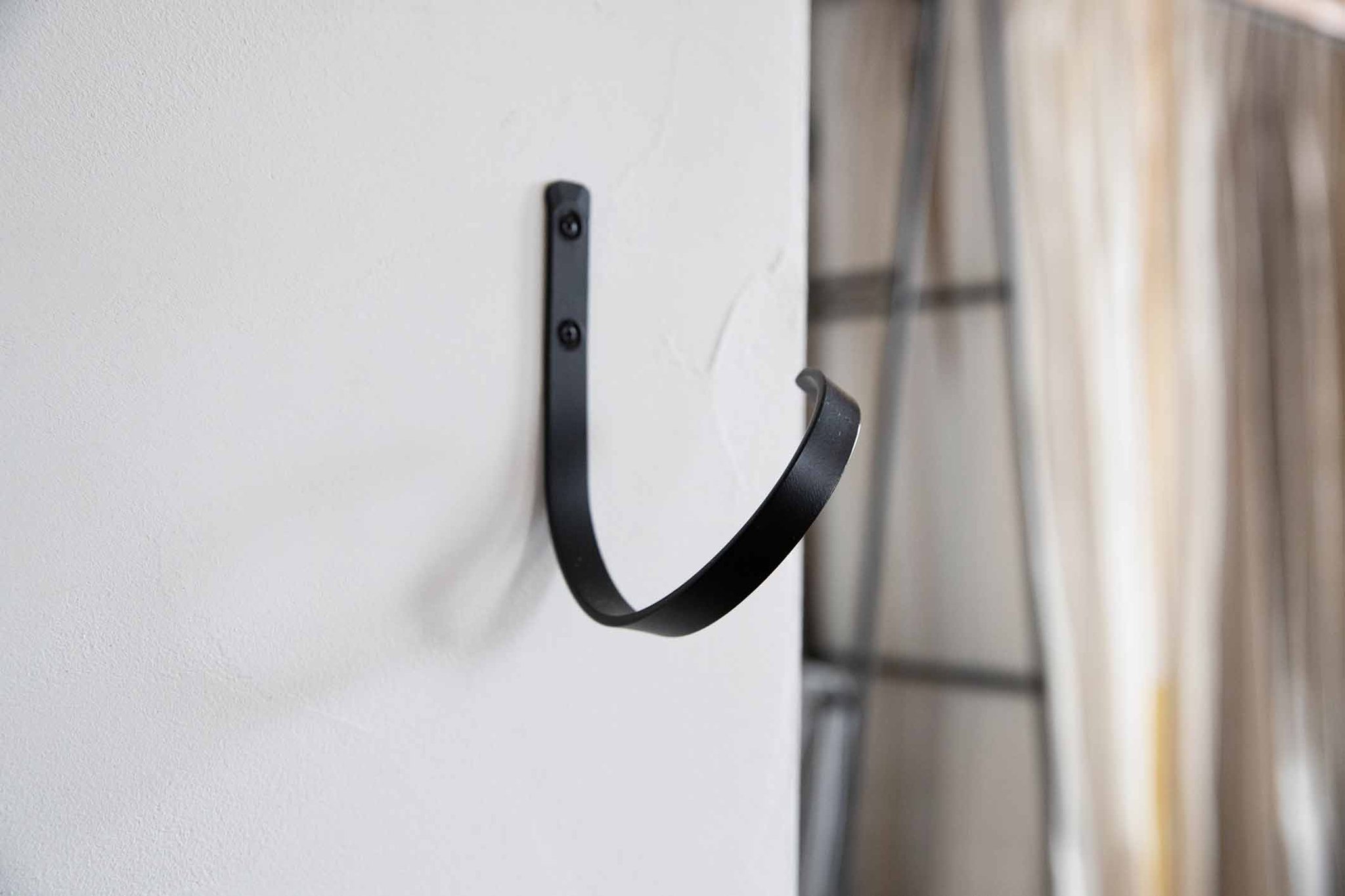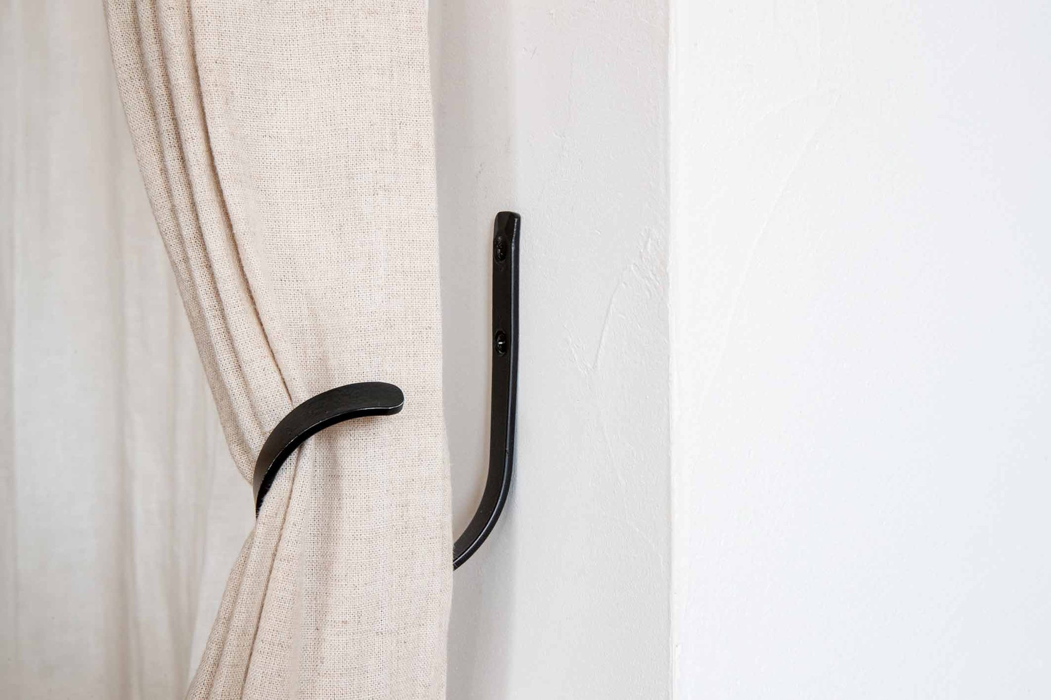 当店で企画・設計し、アイアン作家さんが制作を行っています。カーテンをしっかりホールドしつつ、出っ張りすぎない絶妙なカーブは、熟練の手作業から生まれるもの。一点一点、少しずつ異なる個体差や色ムラも、ハンドメイドならではの持ち味です。