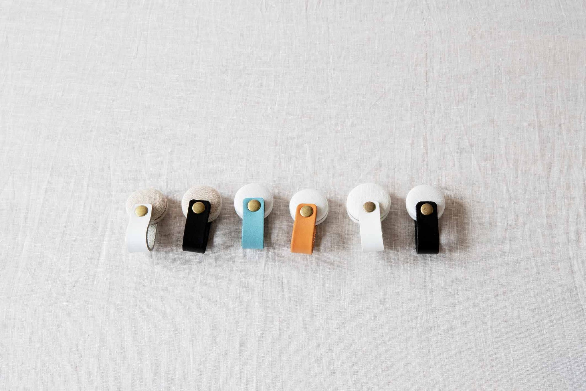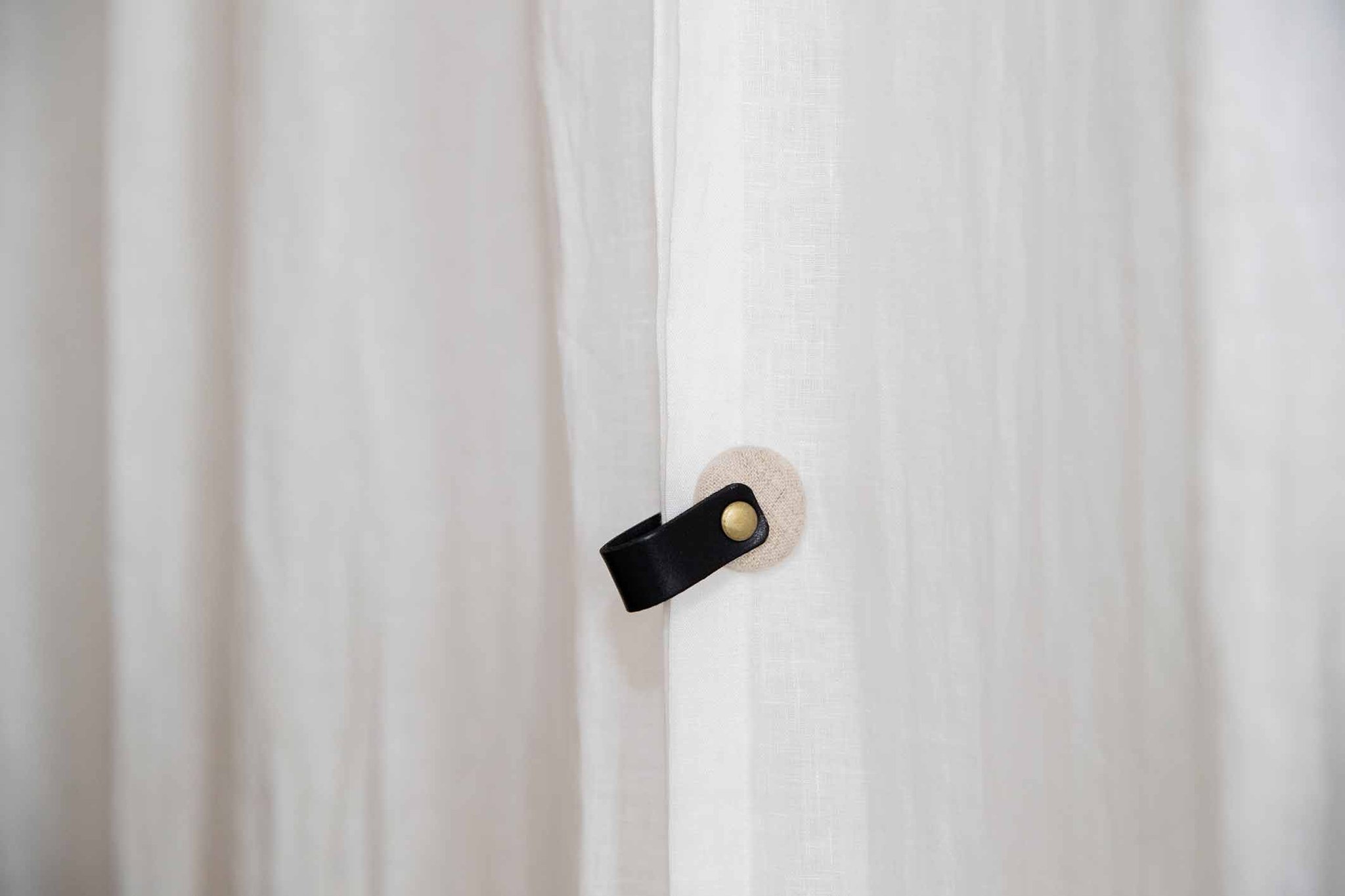 リネン生地でくるんだマグネットに、カラフルなレザーを組み合わせました。カーテン同士の隙間が気になるときに留めたり、裾を上げて子どもやペットのいたずらを防止したりと、アイディア次第で使い方はいろいろ。リネン生地はホワイトと生成の2色、レザーはキャメル、水色、ブラック、ホワイトの4色展開です。