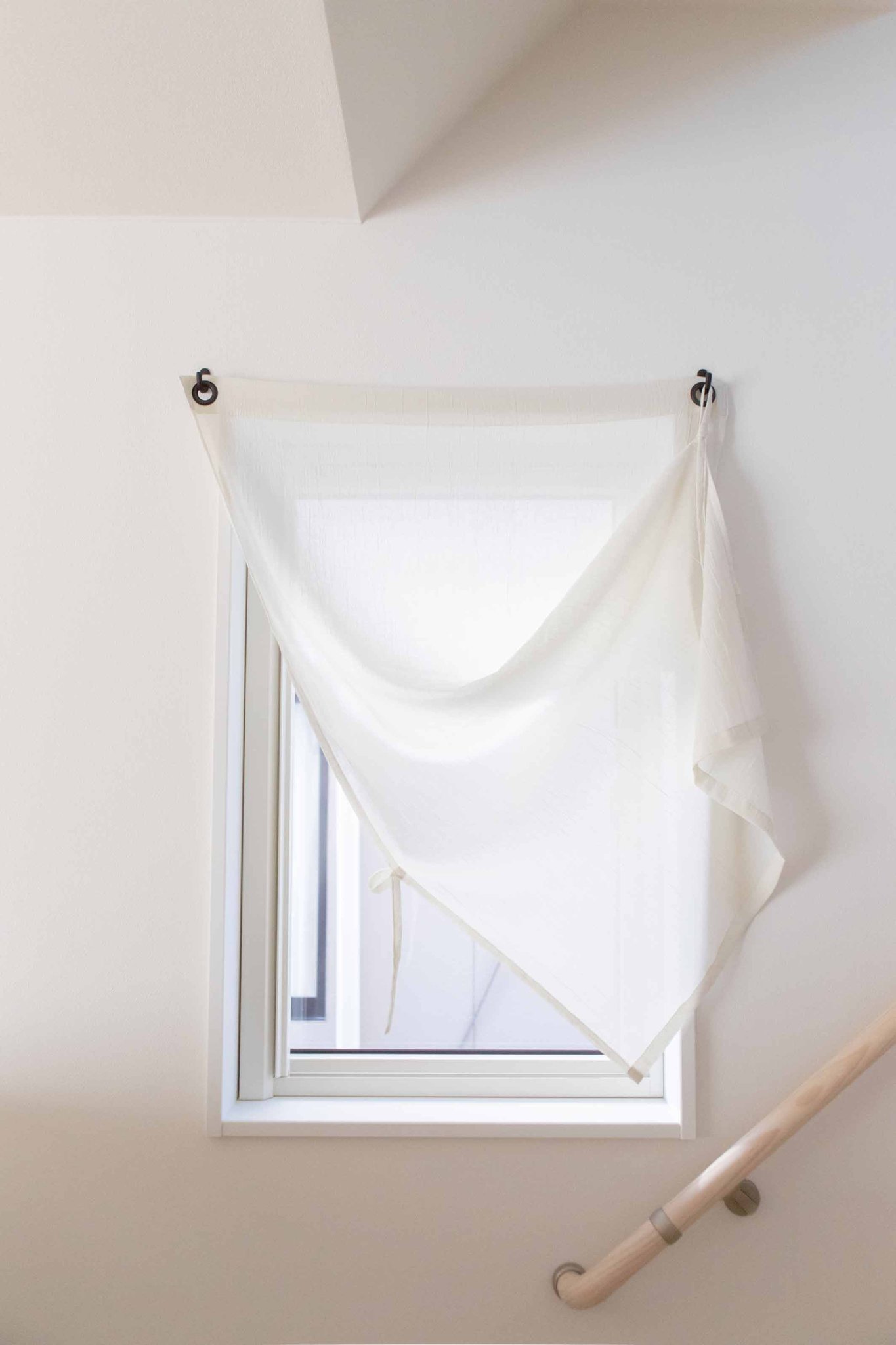 「あったらいいな」というお客さまの声をきっかけに、試作を重ねて生まれたChocolate-houseオリジナルのカーテンです。布地にハトメ穴を空けてあり、取り付けはフックに引っ掛けるだけ。カーテンレールが不要なため、重たい印象にならず空間をスッキリ見せることができます。両サイドの紐をリボンに結んだり、フックに引っ掛けたりと、さまざまな形に変化します。